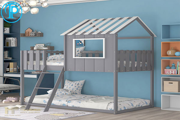 Mẫu giường tầng này được thiết kế như một ngôi nhà nhỏ xinh xắn với mái che và cửa sổ giả, tạo nên không gian riêng tư và kích thích sự sáng tạo của trẻ. Bé sẽ cảm thấy giường ngủ như một căn cứ bí mật hay lâu đài cổ tích.